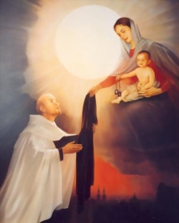Przyjmij, synu, szkaplerz twego zakonu, jako znak mego braterstwa, przywilej dla ciebie i wszystkich karmelitów. Kto w nim umrze, nie zazna ognia piekielnego. Oto znak zbawienia, ratunek w niebezpieczeństwach, przymierze pokoju i wiecznego zobowiązania.
